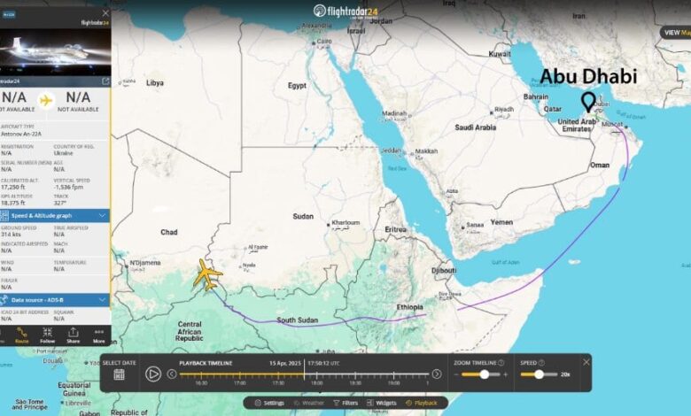Follow-up- Al-Zawiya Net- Ana-22A military transportation of the Ukrainian shipping company Antonov Airlines from Abu Dhabi, the capital of the United Arab Emirates, took off on April 15 and landed on the Chadian border with Sudan at Umm Jars Airport, according to Flightradar24 data.
